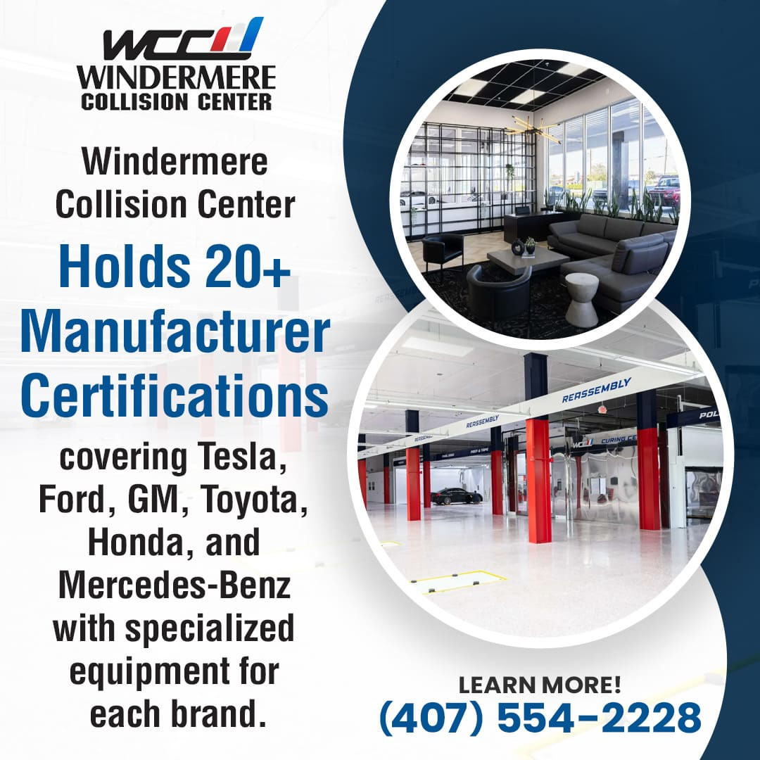 Since 2016, Windermere Collision Center has served Winter Garden and surrounding Central Florida communities with manufacturer-certified auto body repair services. The family-owned facility earned recognition as Orlando's Best Body Shop in 2024 through consistent quality and customer satisfaction.