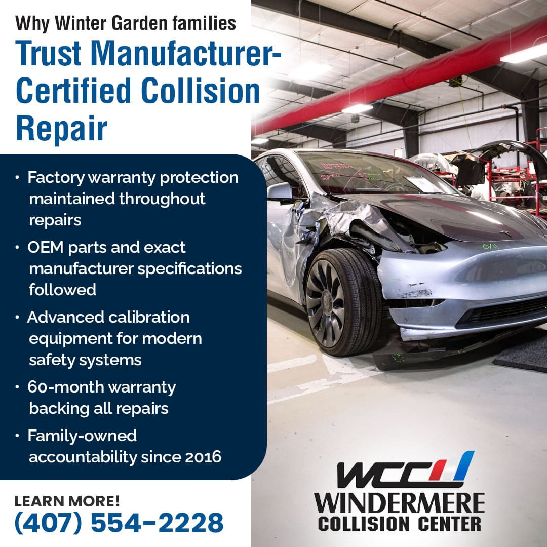 The facility serves Winter Garden, Windermere, Winter Park, Orlando, Oakland, Gotha, Ocoee, Horizon West, Bay Hill, and nearby Central Florida areas. Windermere Collision Center guides customers through insurance processes, follows exact manufacturer specifications, and provides written warranties backing all repairs.